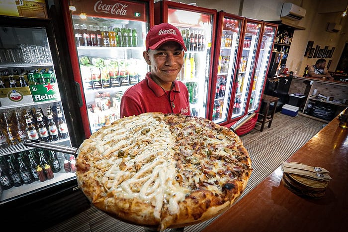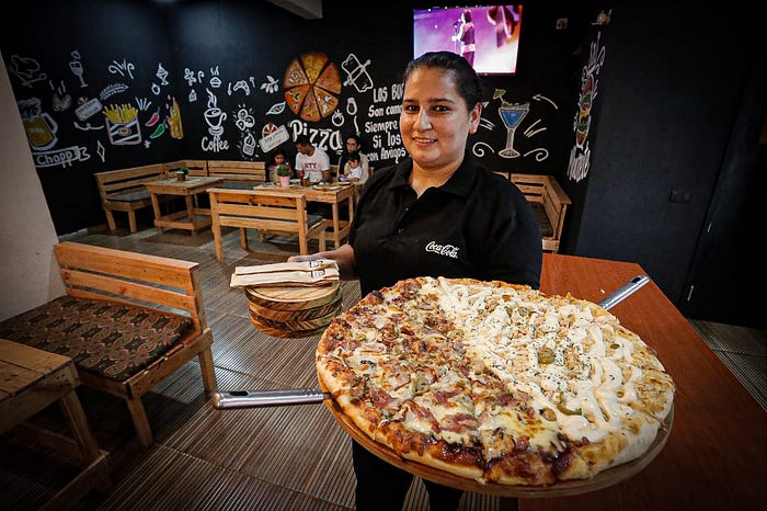 “Una cosa importante son los tamaños que ofrecemos a los clientes son 5 tamaños, la redonda de cuatro porciones, la mediana de seis porciones, la pizza grande de ocho porciones, la pizza de medio metro ese sí sería una pizza de 50×20 cm con 12 porciones, y luego tenemos la pizza familiar redonda con 12 porciones, que es bastante grande. Hacemos con borde relleno y sin borde”, comentó Julio.