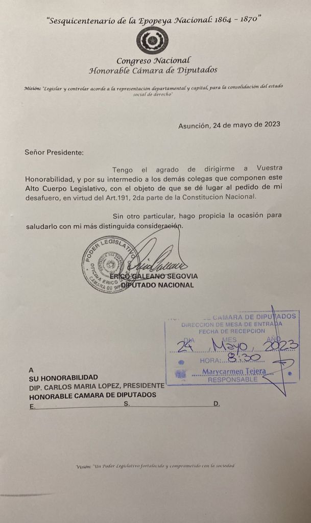 Finalmente, el diputado Erico Galeano tuvo que rever su postura inicial de declararse inimputable y con doble fuero, y presentar hoy la nota pidiendo a sus colegas tratar su desafuero en plenaria.La nota escueta fue entregada hoy a las 8:30. Ahora, queda en manos de los diputados incluir en el Orden del Día de la fecha de la sesión convocada este miércoles 24 de mayo a las 9:15.