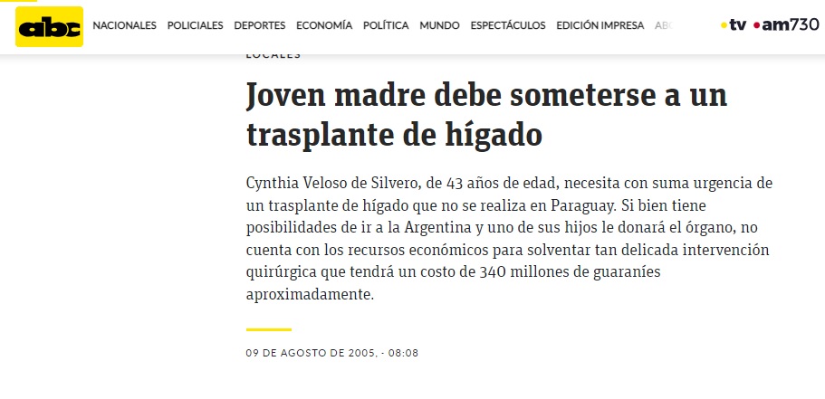 En noviembre del 2008, luego de una dura y larga lucha, la ciudadana capiateña Cynthia Veloso logró que el Gobierno de Paraguay y Argentina firmaran un convenio para que ella pudiera viajar a Argentina para recibir el trasplante de hígado.