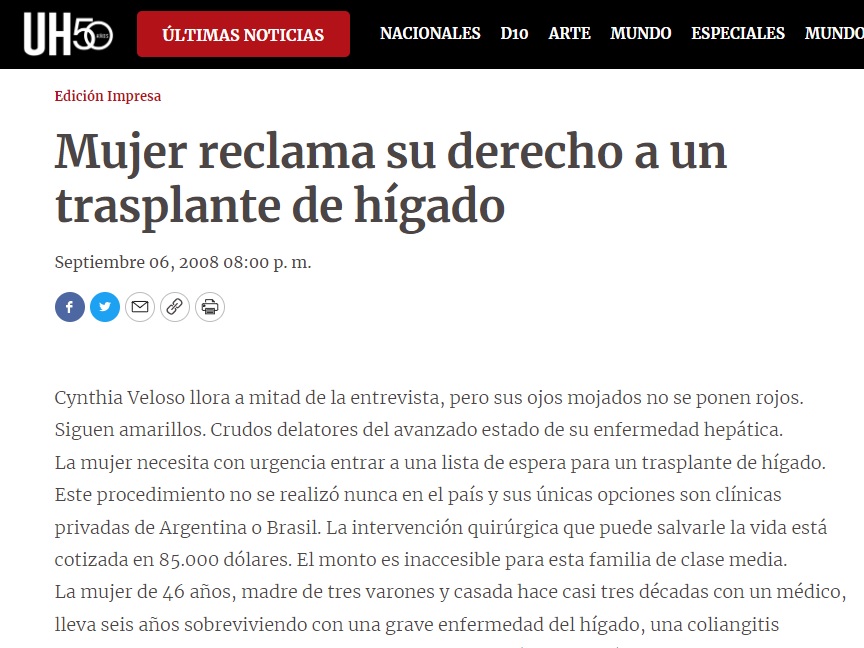Como asegurada del IPS recibió su diagnóstico en este hospital en el 2002, pero los propios médicos locales le recomendaron que buscara asistencia en algún centro especializado de los países vecinos, dada la nula experiencia en el área de trasplante hepático a nivel nacional.