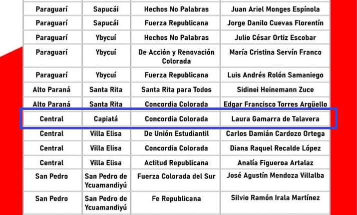 En el Partido Colorado, Concordia Colorada consensuó para candidatar a la concejala Laura Gamarra de Talavera como intendenta de Capiatá, según informó Santiago Brizuela miembro del TEP.