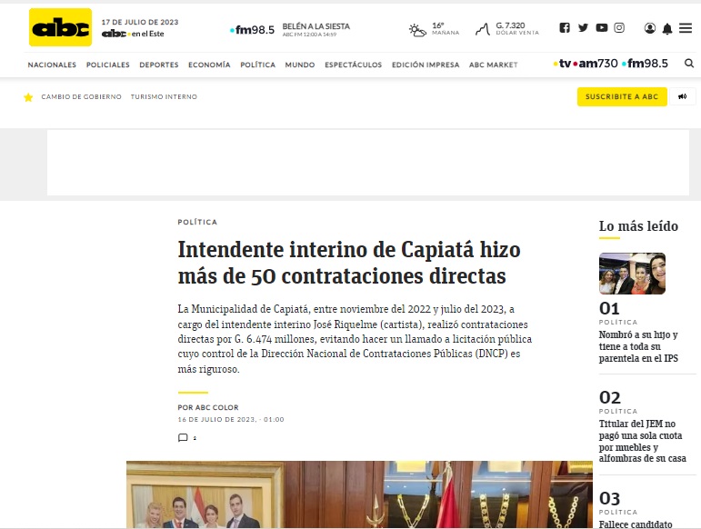 Otro tema que fue divulgado en el ABC Color fue el número de licitaciones convocadas por el Intendente interino José Riquelme. Según contabilizó el medio, el jefe comunal realizó 58 contrataciones directas y destinó G. 6.474 millones de los Royalties para obras varias.