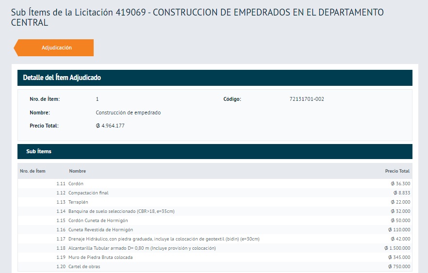 Según la licitación ID 431635, se adjudicó un monto total de G. 142.804.500, correspondiendo al barrio Cicomar G. 66.987.000 del total, según el Comunicado publicado por la Municipalidad de Capiatá. El resto, los G. 75.817.500 se destinaron al empedrado en el barrio San Ramón 3ra compañía Ka’aguy Kupe.