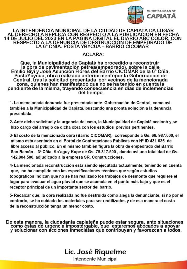 La prensa nacional se hizo eco este fin de semana de dos cuestiones que involucran a Capiatá. Por un lado, el conflicto por el empedrado mal hecho por la Gobernación de Central en el barrio Kennedy zona Cicomar y, por el otro, una serie de adjudicaciones realizadas por el intendente interino José Riquelme.