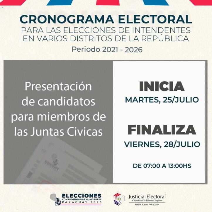 Los trabajos de preparación de útiles, papeletas, documentos y todos los materiales necesarios para la elección de Intendentes en 13 distritos del país, entre ellos Capiatá se extenderán hasta el 1 de setiembre, según la Resolución TSJE N° 3/2023 que establece el Cronograma Electoral.