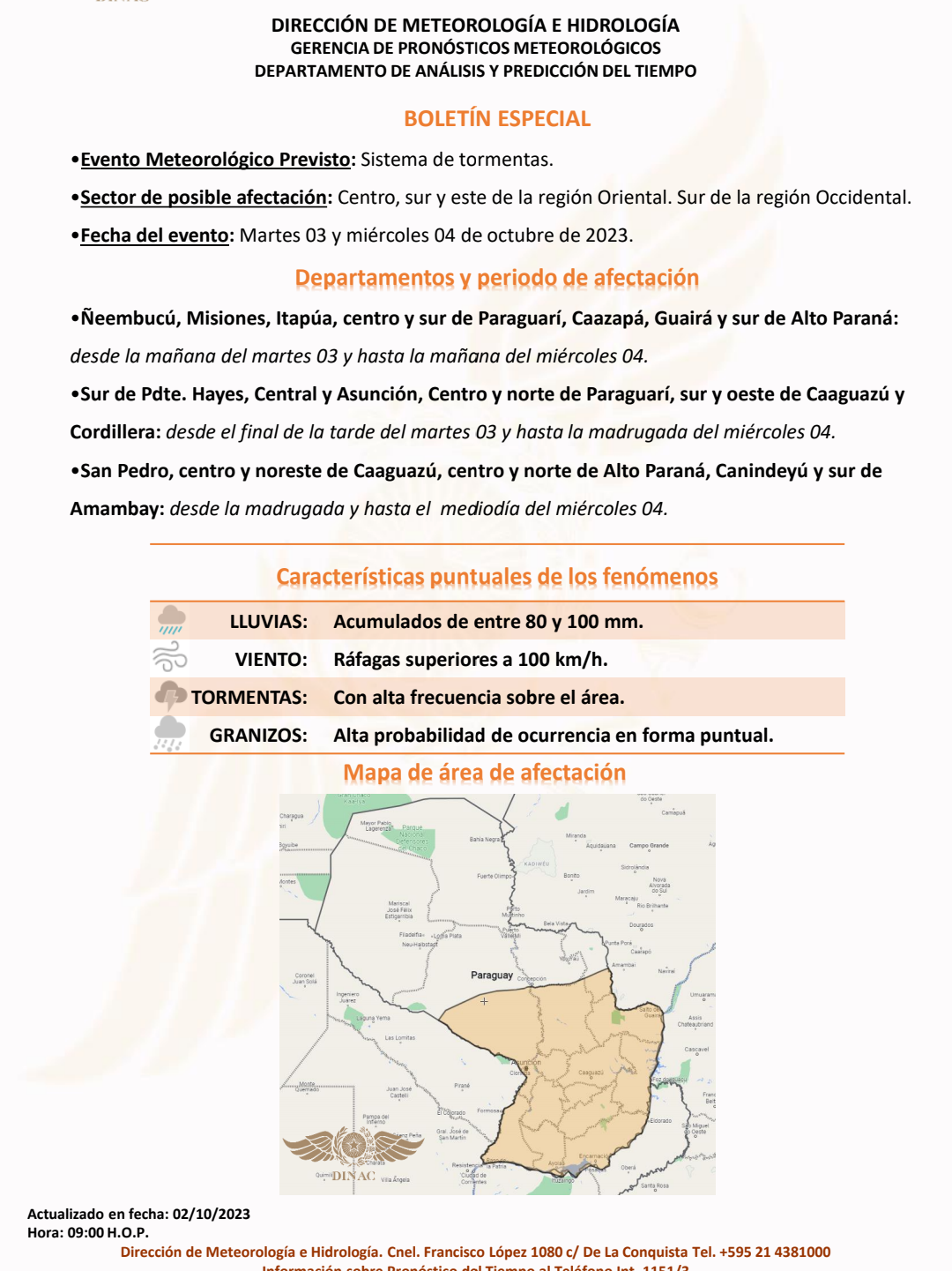 La Dirección de Meteorología e Hidrología emitió un boletín especial en el que pronostican un sistema de tormentas sobre Paraguay, entre mañana martes 3 y el miércoles 4 de octubre.