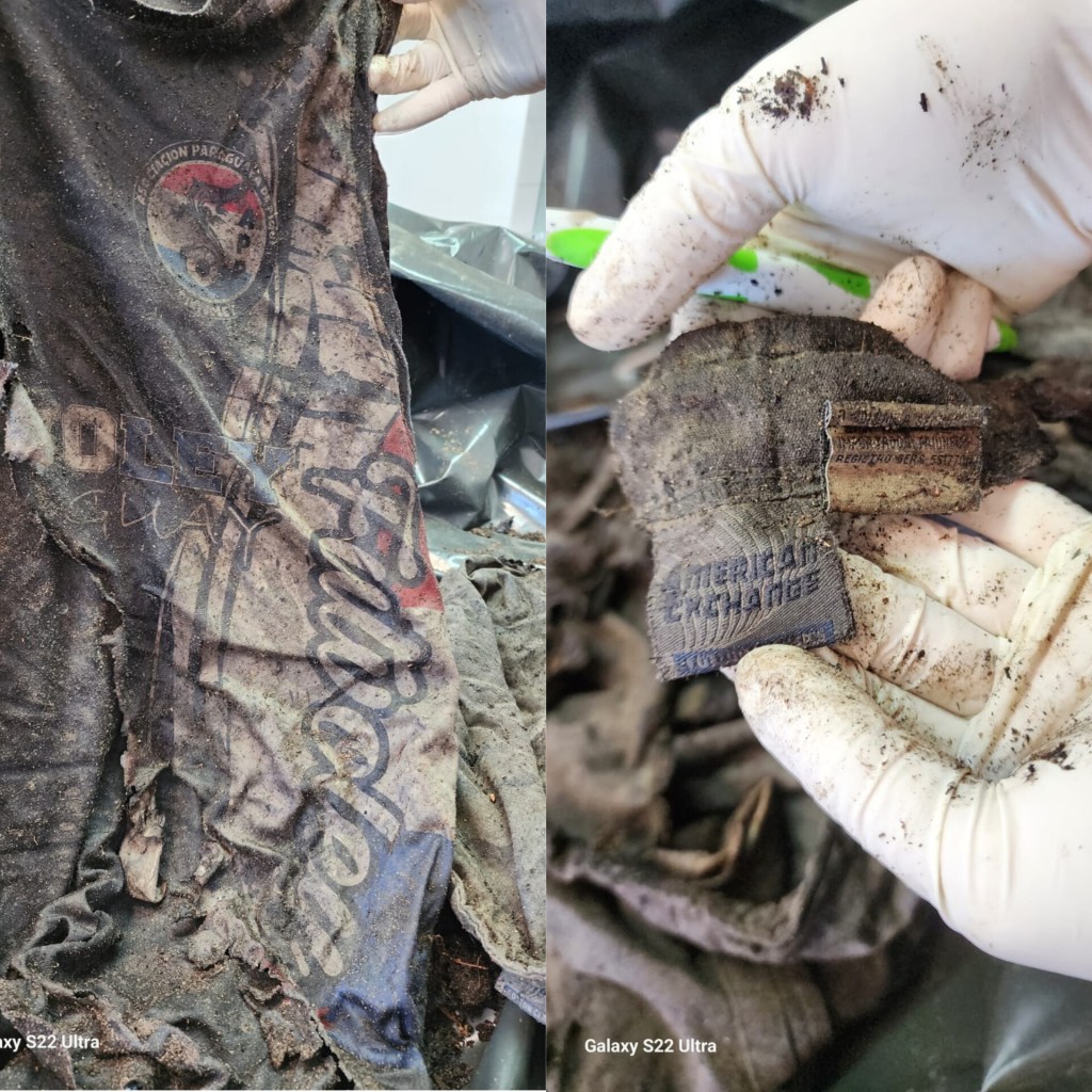 La fiscal Marchuk comentó que los restos óseos estaban envueltos en prendas deportivas, específicamente, una camisilla negra con logo en la parte superior izquierda con la inscripción de Sociedad Paraguaya de Piqui Voley, y una bermuda negra de la marca American Exchange, tamaño grande.