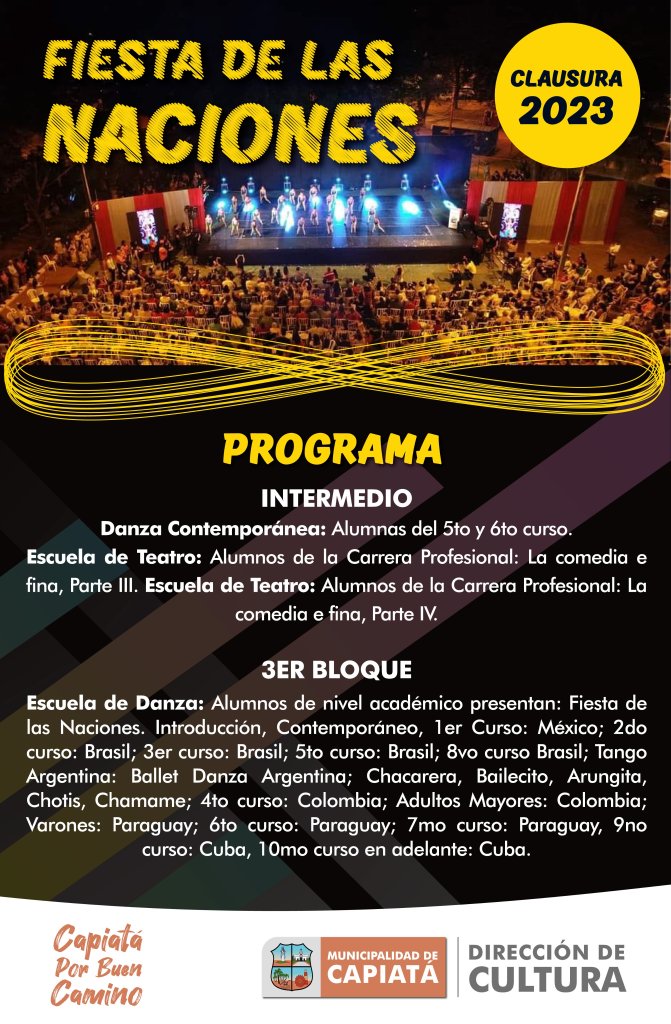 La Fiesta de las Naciones será en la Plazoleta Municipal en PY02 kilómetro 20. Se trata de la clausura de actividades de la Escuela de Guitarra, de la Escuela Municipal de Teatro y de la Escuela Municipal de Danza de Capiatá.