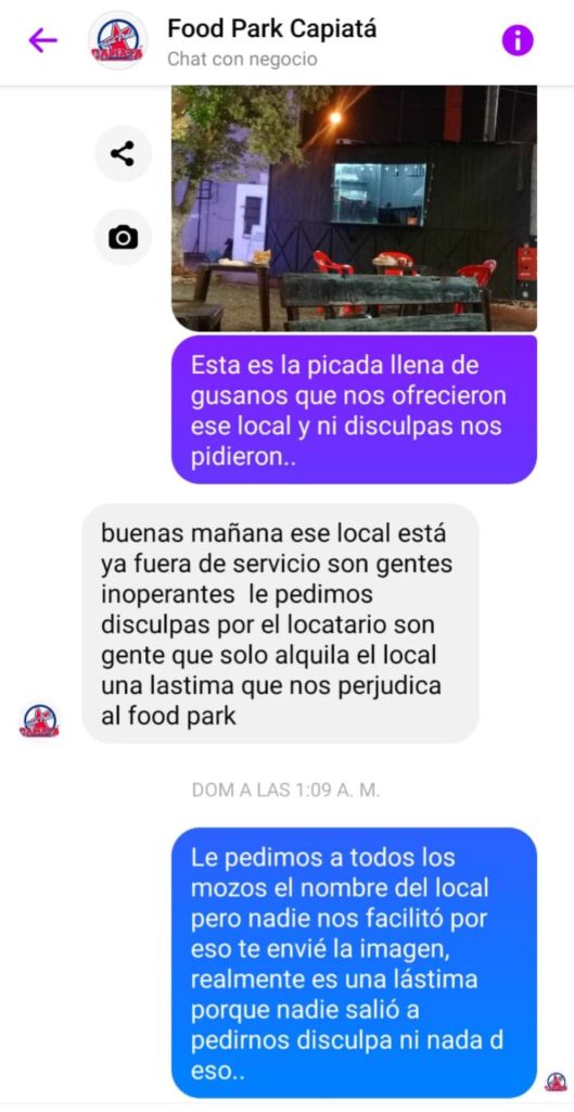 “Buenas, mañana (por el domingo) ese local está fuera de servicio. Son gente inoperante, le pedimos disculpas por el locatario, son gente que solo alquila el local. Una lástima que nos perjudica al food park”, decía el mensaje que recibió John Da Rosa.