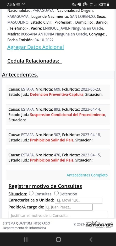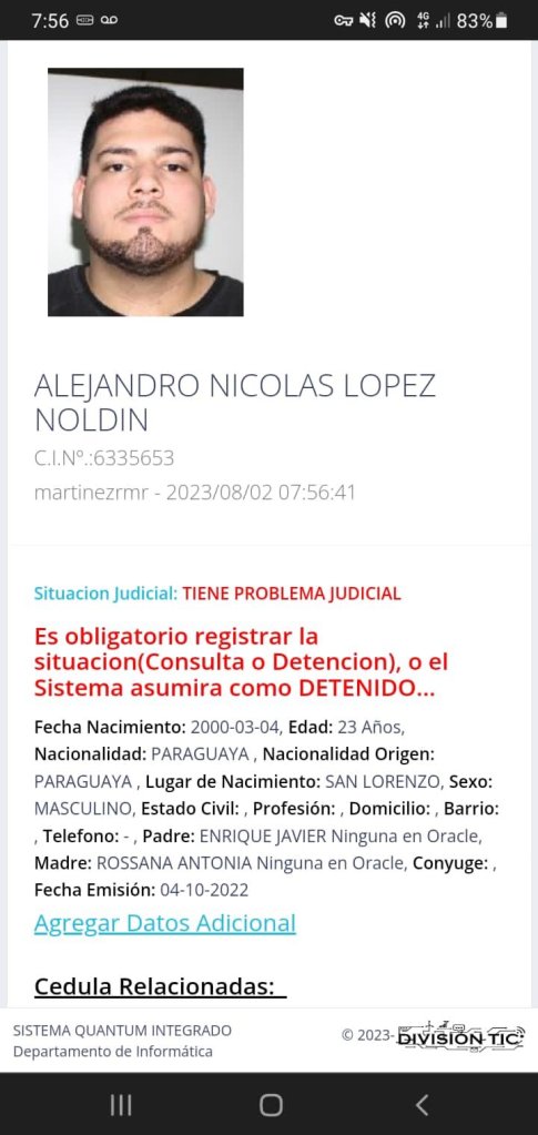 López Noldin, que se negó a hacer declaraciones, fue trasladado a la Comisaría 32ª de Posta Ybycua, donde se incautó su aparato celular, que ahora está bajo custodia de la oficina de guardia. La Policía Nacional manifestó que tanto el detenido como los elementos incautados serán puestos a disposición del Ministerio Público.