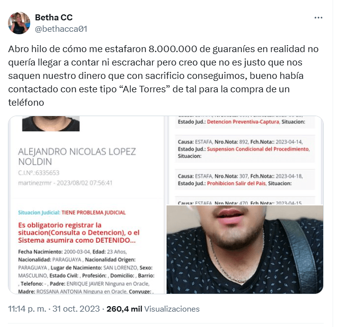 Una de las víctimas del presunto estafador hizo público el caso, mostrando los antecedentes que ya tenía acumulado el detenido https://x.com/bethacca01/status/1719538316373082184
