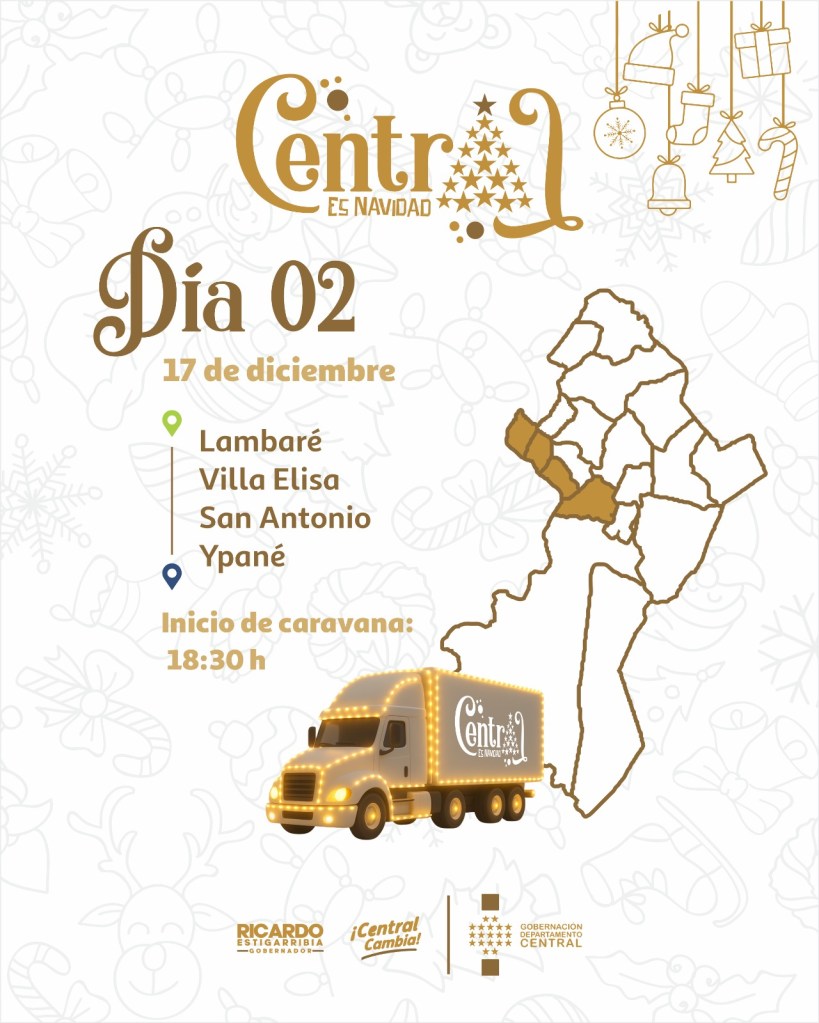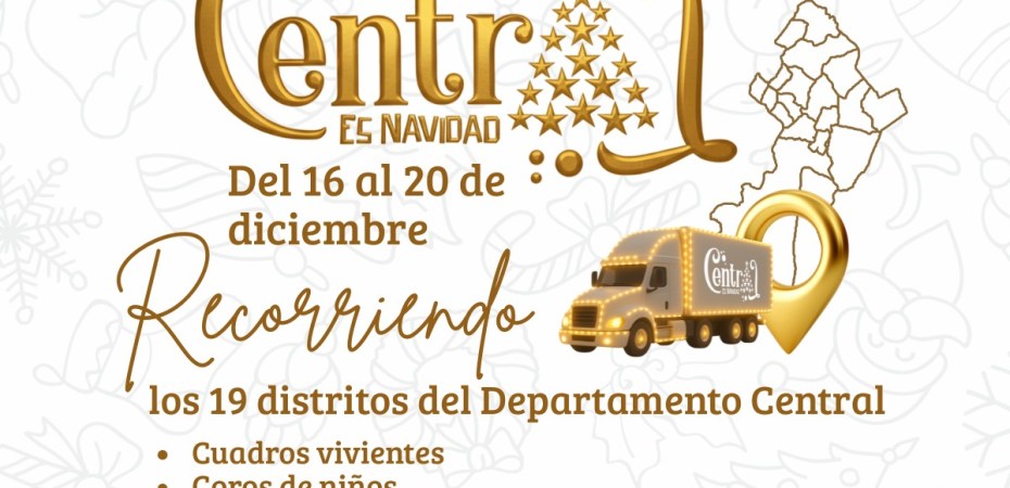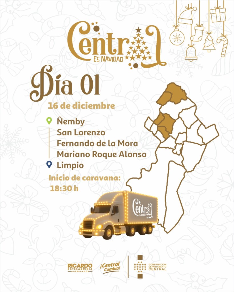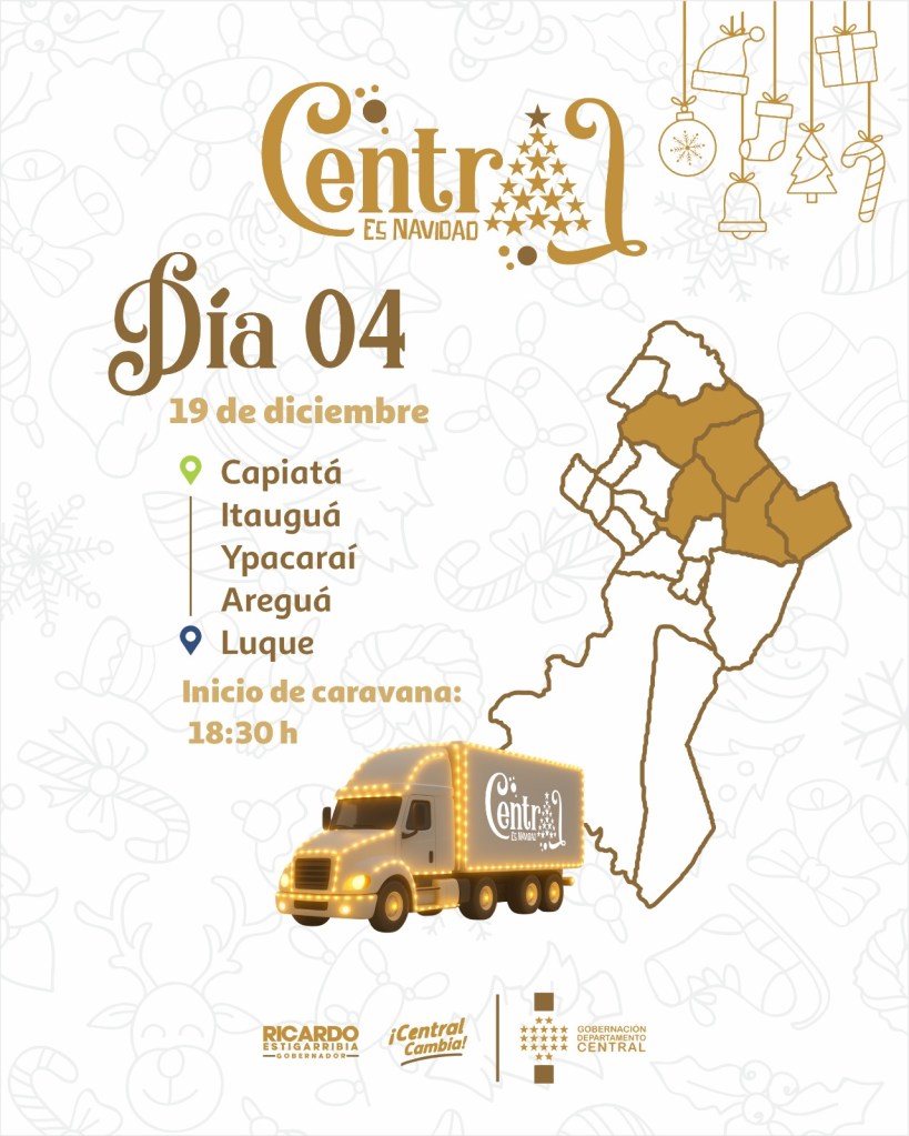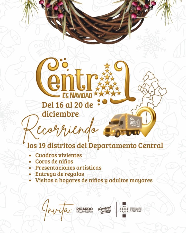 La Gobernación del Departamento Central llevará a cabo la gran caravana navideña “Central es Navidad”, que recorrerá los 19 distritos desde el 16 al 19 de diciembre, y el cierre del megaevento se realizará el sábado 20 en el predio de la institución en Areguá.