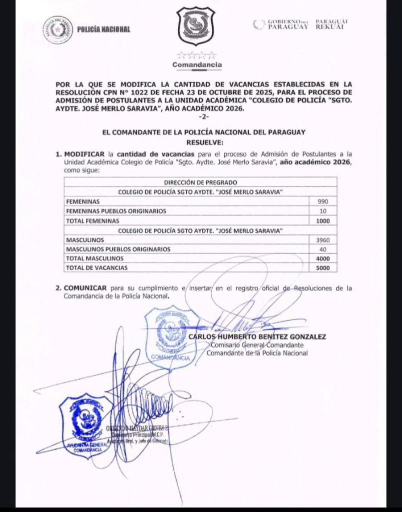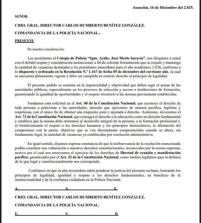 En la nota de fecha 16 de diciembre piden “que se respete y mantenga la cantidad de vacancias destinadas a los postulantes masculinos”, es decir, que se ocupen los 4.000 cupos establecidos, mencionando que dicha disposición está en la Resolución N° 1.167 del 5 de diciembre del 2025.