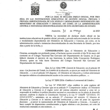 MEC declara tres días de duelo en colegios del país